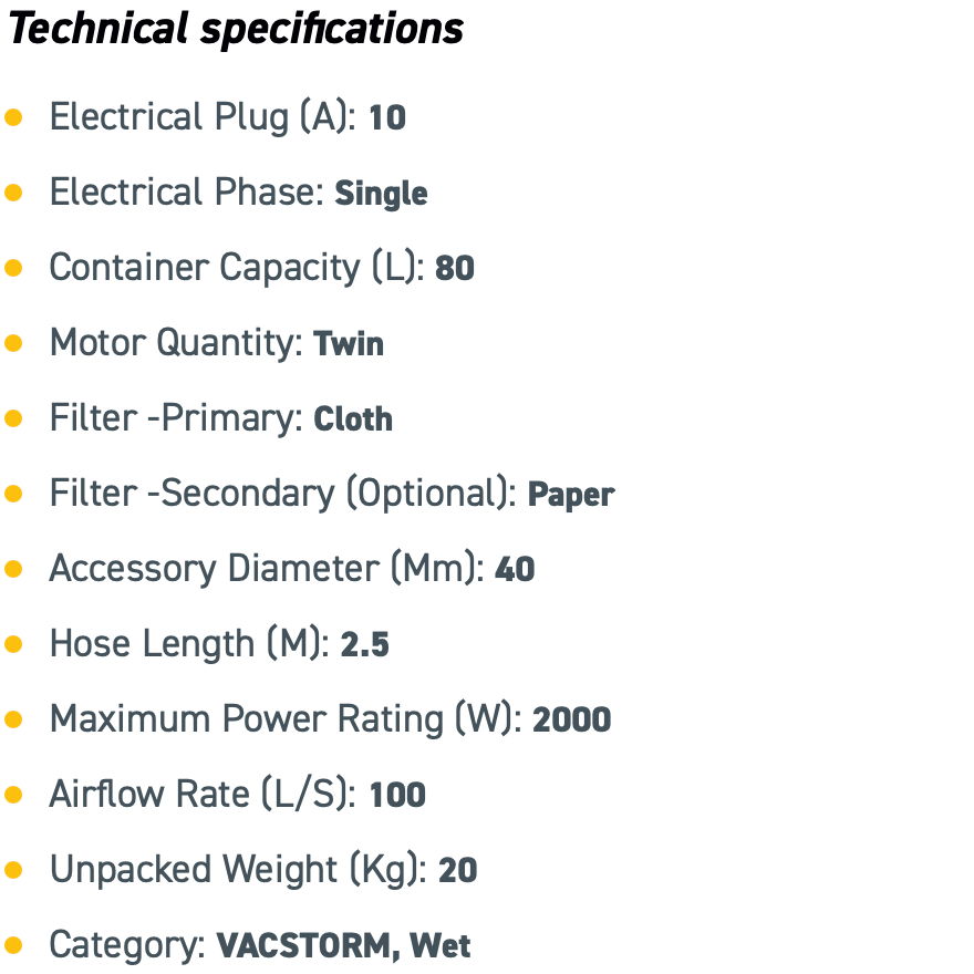 The VACSTORM AS59 wet and dry Italian made vacuum with a large washable filter which you simply remove for wet use, has high quality twin motors, tools and accessories. It is an ideal all-rounder for a variety of applications. With a standard 10 Amp power plug it's a go anywhere machine!